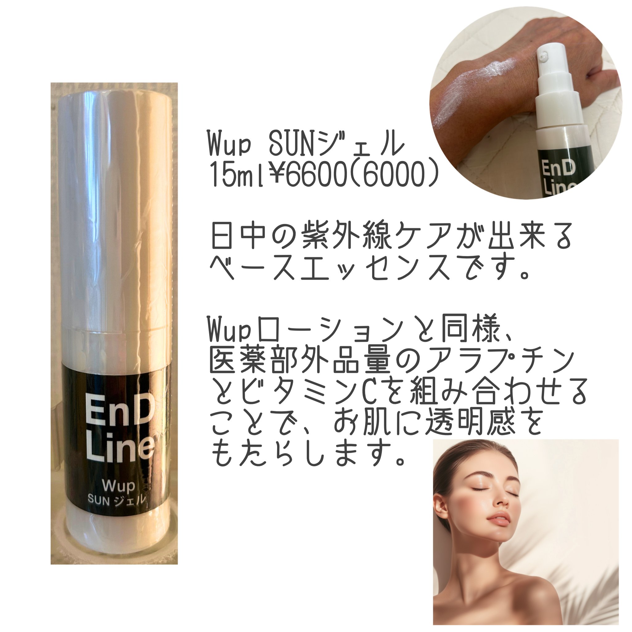 EnDLineシリーズ*Wup SUNジェルはビタミンCとアルプチン、2種類のヒアルロン酸がたっぷり入った日焼け止めベースエッセンスです。